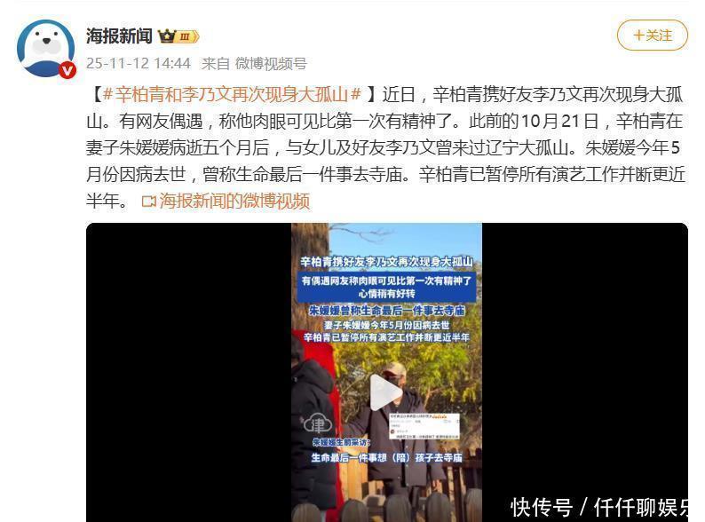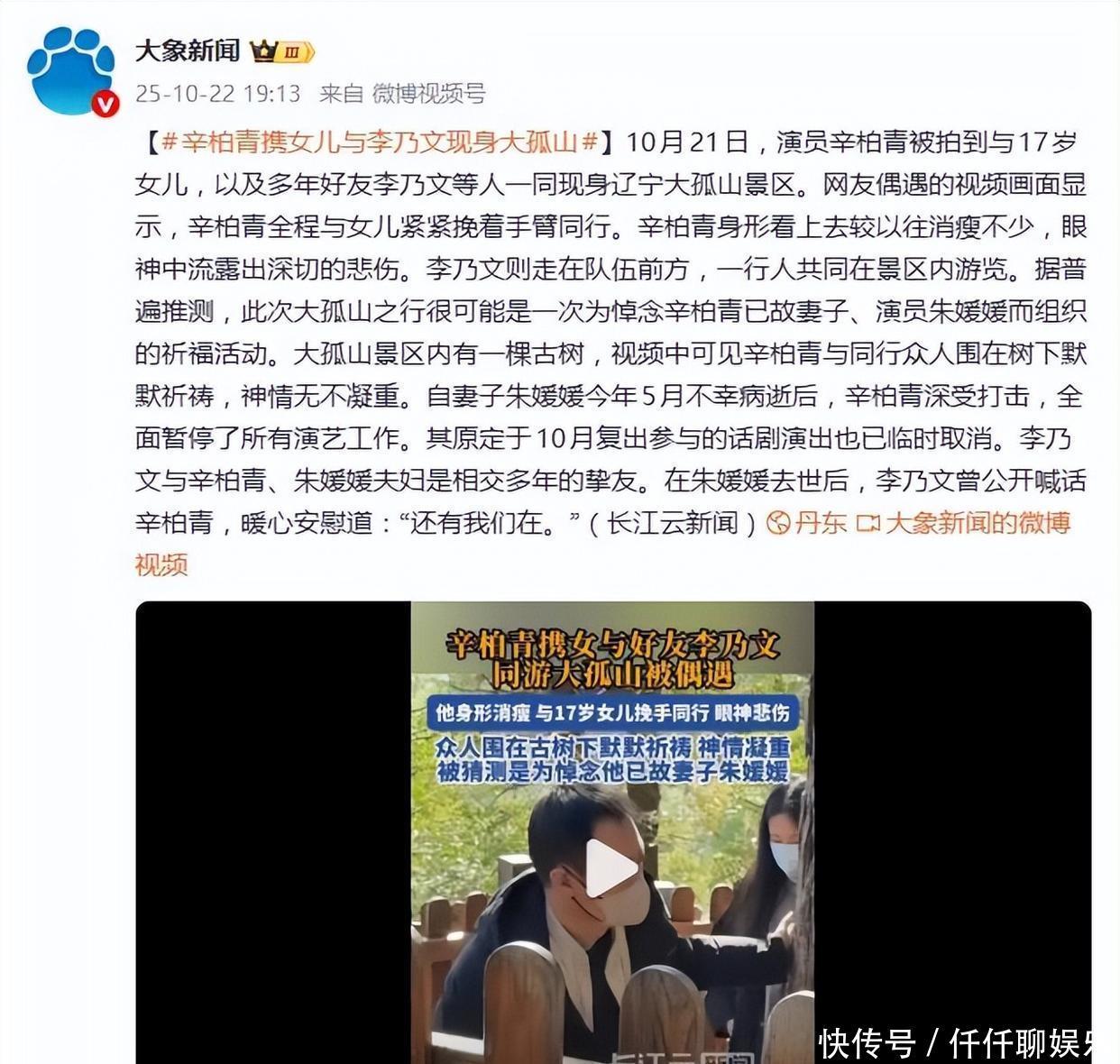 要知道,上一次来大孤山,是2025年10月21日——在他妻子朱媛媛病逝五个月后。那时,他携17岁的女儿辛蕊仪(小名“本本”)与挚友李乃文同行,全程紧挽女儿手臂,身形消瘦,鬓角白发刺眼,眼神里是藏不住的深切悲痛。而李乃文则默默走在队伍前方,像一个沉默的守护者,为父女俩隔开外界的纷扰。